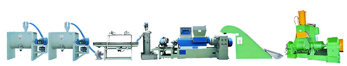 This is EVA compounding line set of machine consisting mixer, elevator, mixing mill, EVA extruder, whirlwind barrel, vibrating conveyor and horizontal mixer. This is the process layout for eva compounding to produce EVA granule. This specification and sizes may differ upon the volume and quantity of production. Customized equipment can be provided for high quality and high productivity for EVA granule.