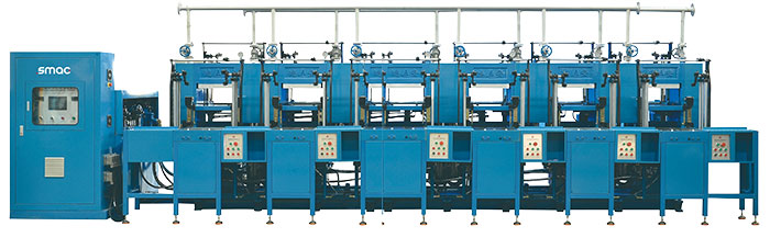 Rubber sole with single or multi color, conductive rubber, rubber soles and other rubber finished product. Machine equipped with safety warning lights, safety curtains and two hand push button, protective shields. For more safety operation available station 6 - 10 with four column with middle plate open device.